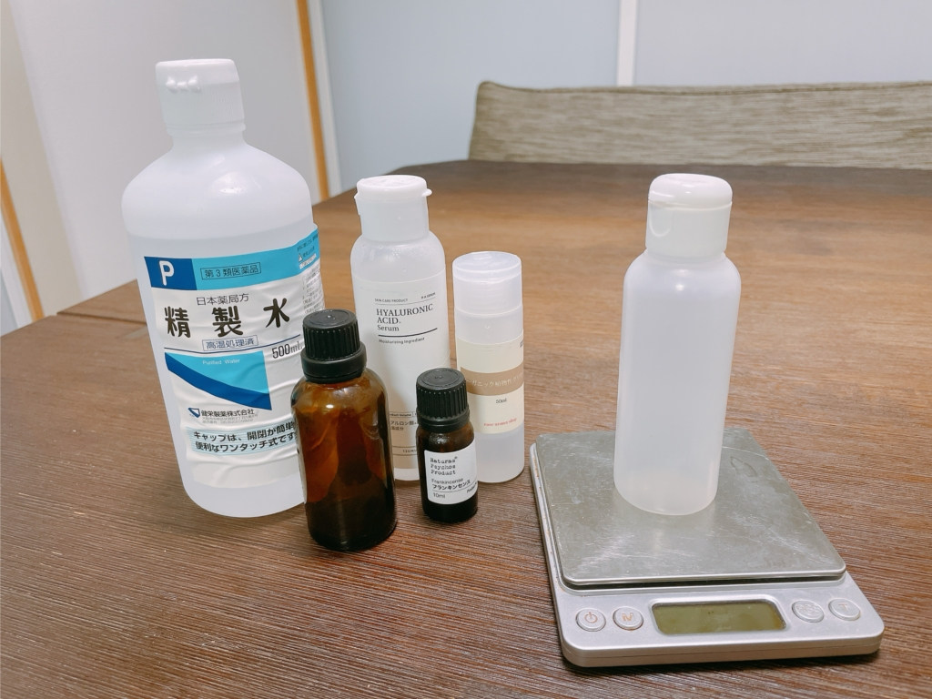 どちらもスキンケアに適した精油ですが、肌が敏感な方は精油を入れずに作るのも◎。香りなしでも、グリセリンとヒアルロン酸の保湿力だけで十分しっとりします。
